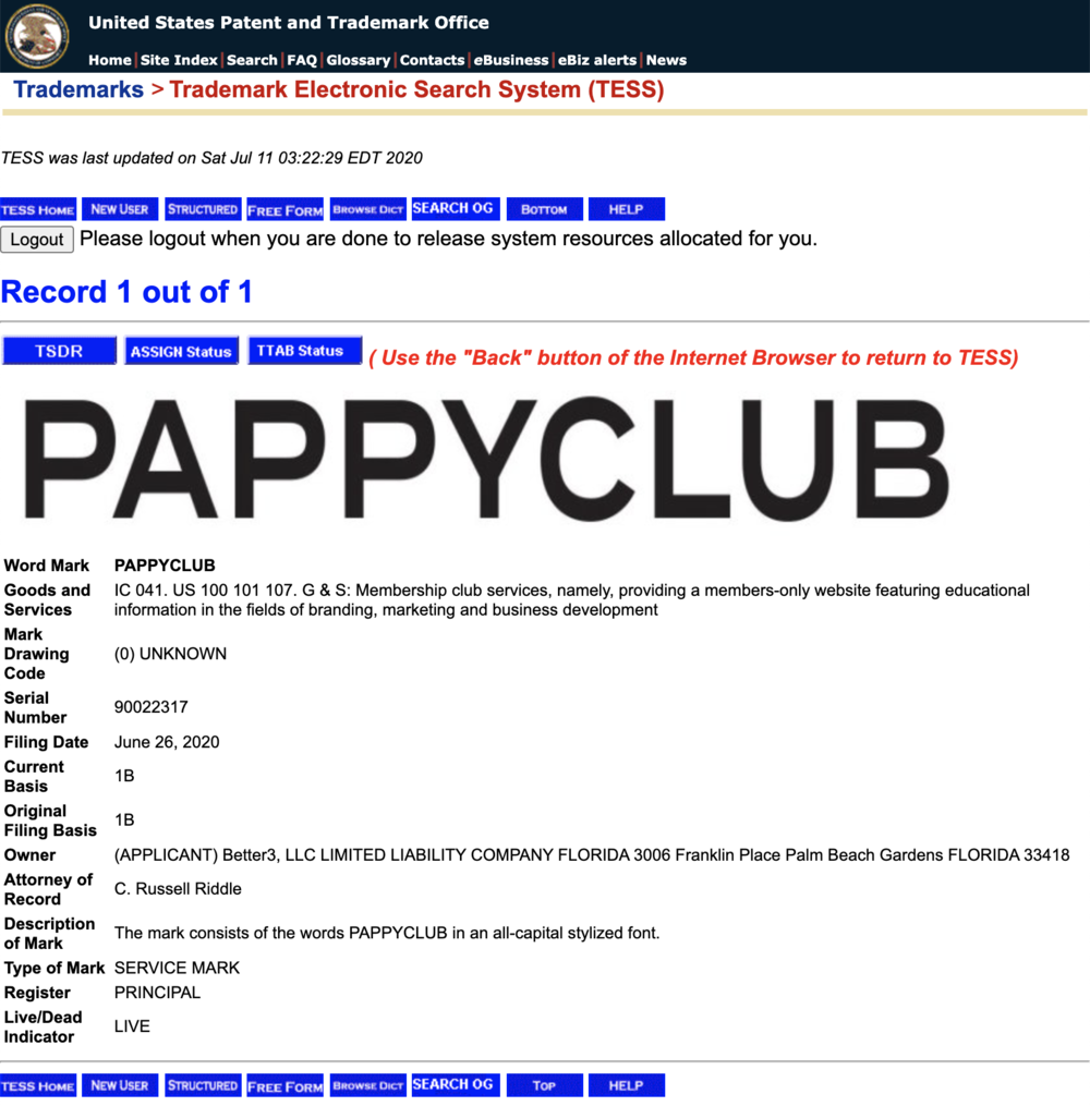 A screenshot of my record in TESS of my PAPPYCLUB filing.